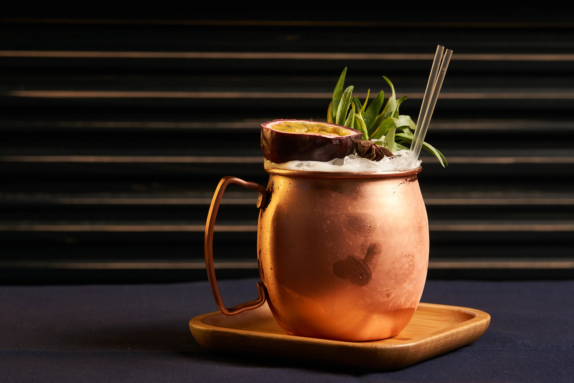 Jim Beam Pineapple, Fresh Lime Juice, Pineapple Juice, Topped with Ginger Beer, Tajín Rim